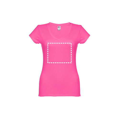 Damen T-Shirt aus 100% Strickjersey und Baumwolle (150g/m²) mit kardiertem Baumwollfaden, tailliert, überlapptem V-Ausschnitt, Verstärkungsband, Jersey-Kragen und Doppelnaht an Ärmeln und Saum. Bei den Farben 194, 195 und 199 bestehend aus 60% Baumwolle und 40% Polyester. Größen: S, M, L, XL, XXL